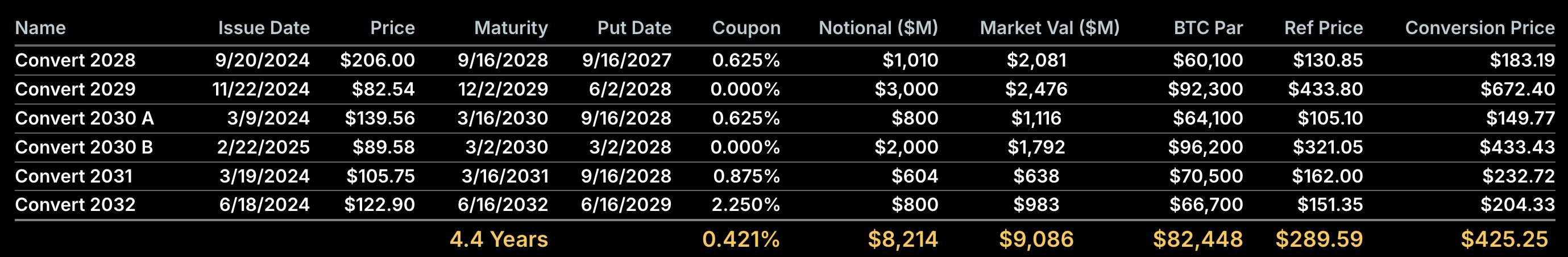 为补充资金,Strategy开始寻求国际市场融资并推出新的融资工具永续优先股(需支付高额股息,8-10%),近期公司通过发行首只欧元计价永续优先股STRE募集资金约7.1亿美元,以支持其战略布局和比特币储备计划。值得一提的是,截至目前,公司有六笔未偿还的可转换债券,但到期日在2027年9月至2032年6月之间。