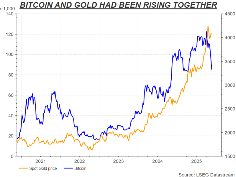两者的共同叙事是对主要货币超发和贬值的担忧,买家声称囤积这两类资产是基于「价值储存」考虑,因其供应有限而非固定收益。然而比特币等加密代币虽在过去十年爆发式增长,但仍然极度波动且高度投机。今年秋季,即便针对主要货币的焦虑转向日元,比特币却跟随科技股「风险规避」抛售,六周内暴跌约三分之一。